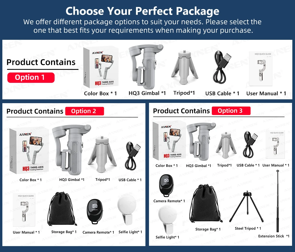 Option 1: Official Standard= AXNEN HQ3 Gimbal + Mini Tripod + USB Cable + User Manual + Color Box